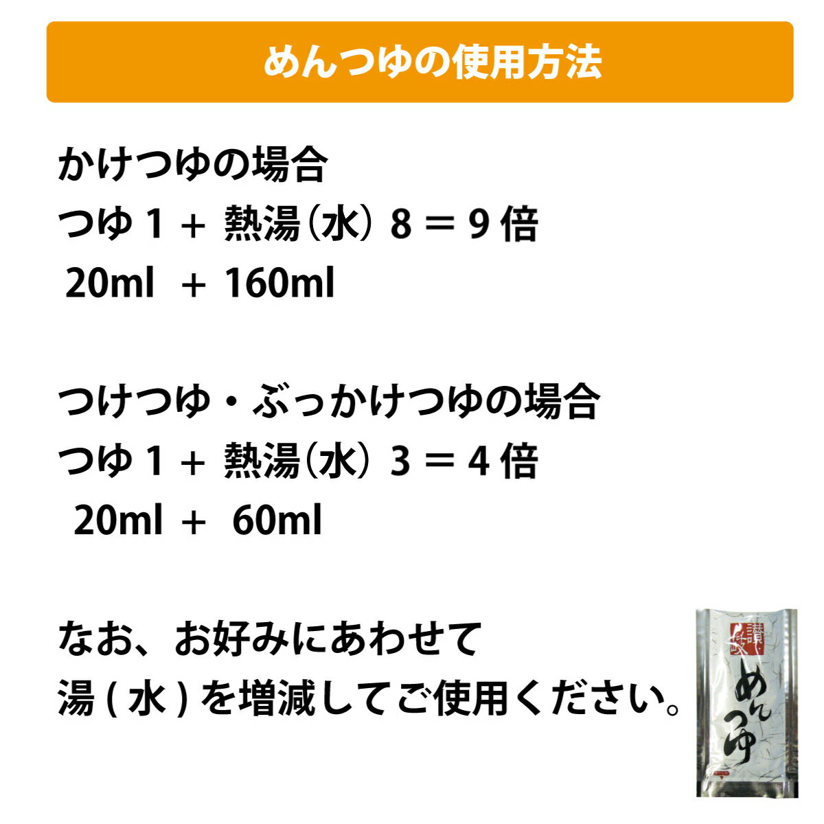 つけつゆ・ぶっかけつゆの場合:【4倍】 つゆ 20mlに対して熱湯(水)60mlで希釈。