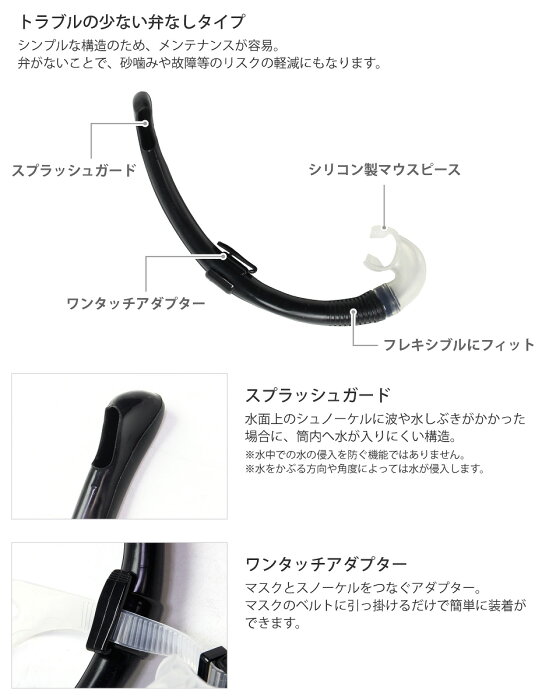 【ブランド】VAXPOT(バックスポット) 【型番】VA-5260 【特徴】 ・シュノーケル&マスクセット ・折りたたみ式シュノーケル(専用ケース付き) ・シリコン製マウスピース ・水が入りにくい構造のスプラッシュガード ・視野の広い一眼レンズ ・ダブルスカートで顔にフィットしやすい ・クリアスカートで明るい視界を確保 ・強化ガラスレンズ使用 ・ベルトの長さ調節が簡単なワンタッチバックル 【説明】 コンパクトに収納が可能な折りたたみ式のシュノーケルと、クリアな視界で水中を楽しむことができるマスクのセット。